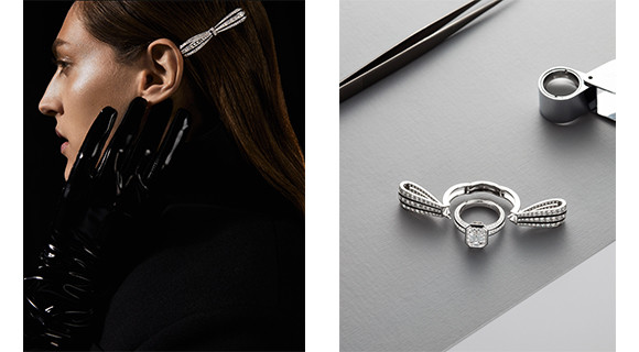 ブラックラッカーとダイヤモンドのシンプルな組み合わせがモダンで端正なボウタイはバレッタとして、ブローチとして。甘さがないボウタイのブローチはメンズスーツにもよく似合う。アーカイブの1928年のブローチにインスパイアされたもので、クレールはその美しさはそのままマルチウエアなジュエリーをクリエイトした。ブラックラッカーが縁取るエメラルドカットのダイヤモンドのソリテールリングはそのままで、あるいはボウタイリングにも姿を変える。