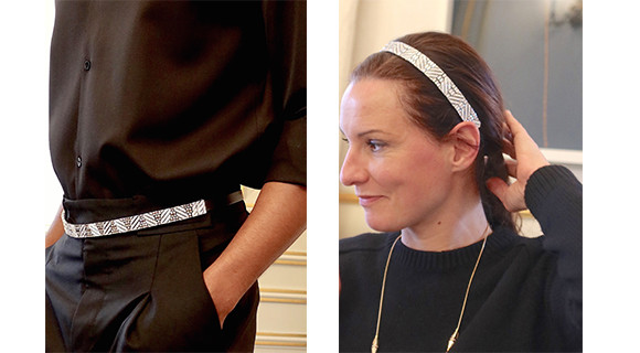 左:革のベルトをセットして、ヘリンボーンのタキシードベルトに。 右:クレール自らモデルとなってヘアバンドとしての使い方を説明。photos:Mariko Omura