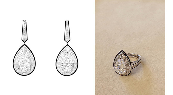 細長くカットされたダイヤモンドに囲まれたペアシェイプのダイヤモンド。イヤリングもリングも黒いエッジが力強さを際立たせる。黒いラインはラッカーによるものだ。硬いオニキスは細いカットに不向きなので、この新作コレクションではオニキスが使えないデザインでは黒いラッカーを使用。オニキスでもラッカーでも、美しさに遜色はない。