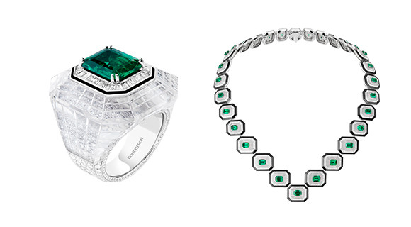 左:ユニセックスリングのシュヴァリエール エメロード。4.3カラットの八角形のエメラルドはヴァンドーム広場を象徴し、ロッククリスタルが石畳を表現。ロッククリスタルの下には、パヴェダイヤモンドがセットされている。コロンビア産エメラルド、ダイヤモンド、オニキス、ブラックラッカー、ホワイトゴールド、プラチナ。 右:ネックレスのコル エメロード。Vネックに沿うように、28個のエメラルドを大胆にも水平に配置したコンテンポラリーなデザインだ。グリーン、白、黒の色合わせにエレガンスが漂う。コロンビア産エメラルド28石 計24.59カラット、ダイヤモンド、オニキス、ロッククリスタル、ホワイトゴールド、プラチナ。