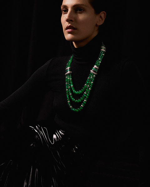 パティアラのマハラジャのために1928年にブシュロンが制作したジュエリーの中には、エメラルドのビーズを用いたジュエリーが少なくなかった。クレールはそれに着想を得て、このプラストロンを女性のためにクリエイト。ふんだんに用いられているエメラルドはザンビア産。透明ながら深い緑色が素晴らしく、クオリティも高い。マルチウェアなネックレスで、パーツを外してチョーカー、ブレスレットとしても着用できる。