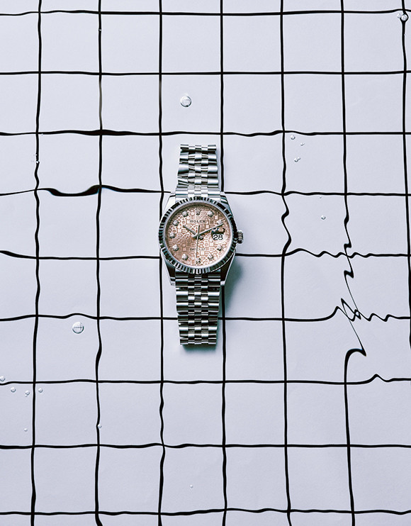 今年の新作は、ジュビリーモチーフをグラフィカルに刻んだピンクの文字盤に、きらめく10ポイントのダイヤモンドをセット。ホワイトゴールドのフルーテッドベゼルと質の高いステンレススチール「オイスタースチール」のジュビリーブレスレットがリュクス感たっぷりに輝く。