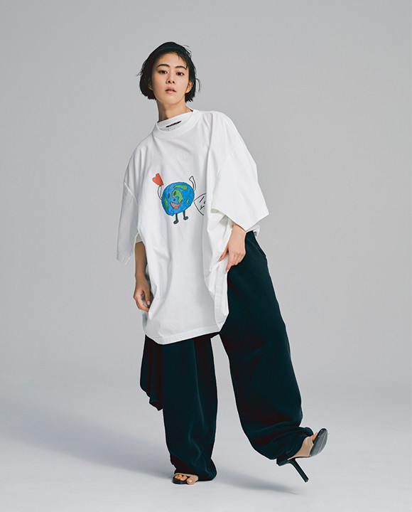 極端なまでのビッグサイズTシャツ×スウェットパンツのボーイッシュなコーディネートにヒールを合わせて。Tシャツにプリントされた愛らしいキャラクターを通してメゾンが伝えるのは、ピースフルなメッセージ。