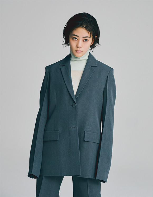 コンクリートのような色合いが美しいブルーグレーのセットアップは、ジャケットのアームにクリースを施して、構築的なシルエットを強調。インナーに差し込んだペールブルーのニットで、やわらかさをプラス。