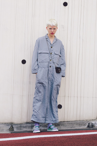 ジャンプスーツ¥79,200/トリコ・コムデ ギャルソン(コム デ ギャルソン) 眼鏡¥31,900/ブラン(ブリンク ベース) チェーン付きカードケース¥47,300/3.1 フィリップ リム(3.1 フィリップ リム ジャパン) サンダル¥168,300/ロジェ ヴィヴィエ(ロジェ・ヴィヴィエ・ジャパン) ソックス¥4,840/キワンダ(キワンダキワンダ)