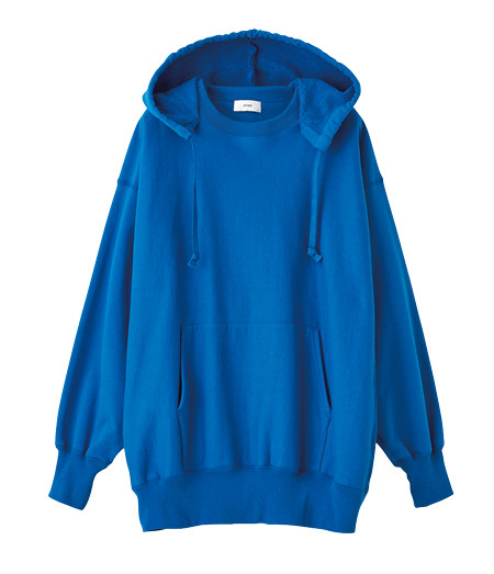 ビッグシルエットのパーカには、コットン裏毛素材を使用。鮮やかなブルーとヴィンテージに散見される後付けフードのディテールに、こだわりを感じる。パーカ¥38,500/ハイク(ボウルズ)