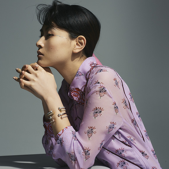 プライベートで愛用しているダイヤモンドジュエリーは、生まれた時にプレゼントされたネックレスです。繊細なチェーンに一粒ダイヤが付いたものなんですが、それを手首に2重に巻いて、ブレスレットとしていまも使っています。今回着けた中では、バングルがとても印象的でした。自分で選ぶのは華奢なタイプばかりなので、太めでがっしりとしたフォルムも、またそれを重ね着けするスタイリングも、すごく新鮮に感じました。