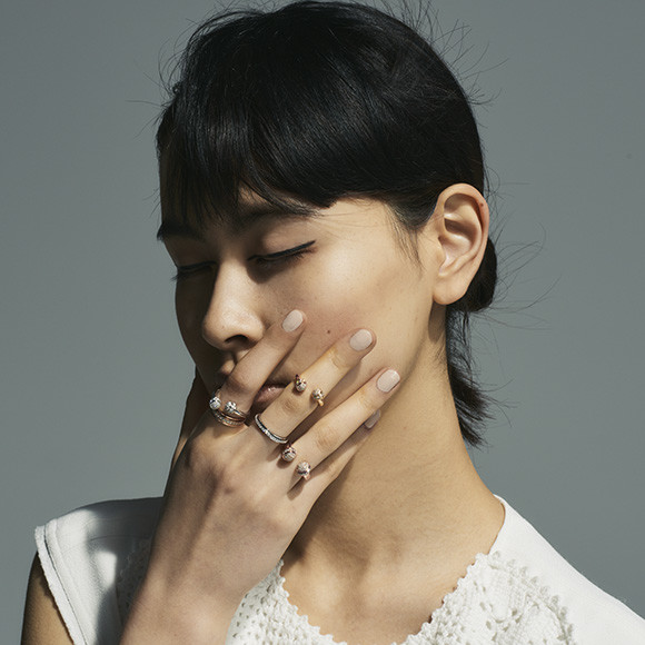 リング「ポセション」人指し指上から、(WG×ダイヤモンド)¥541,200、 (PG×ダイヤモンド)¥616,000、 中指上から、(PG×ダイヤモンド)¥514,800、 (WG×ダイヤモンド)¥484,000、薬指 (PG×ダイヤモンド)¥805,200/以上ピアジェ(ピアジェ コンタクトセンター)  ドレス¥550,000(予定価格)/クロエ(クロエ カスタマーリレーションズ)