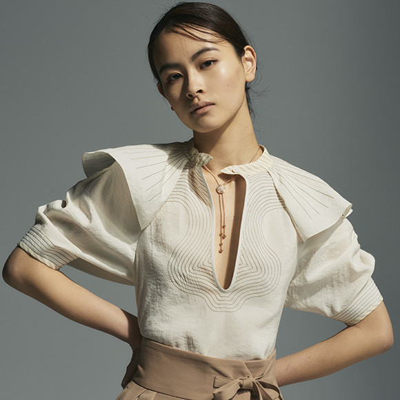 ペンダント「ポセション」 (PG×ダイヤモンド)¥1,108,800/ピアジェ(ピアジェ コンタクトセンター)  ブラウス¥192,500、パンツ¥166,100/ともにクロエ(クロエ カスタマーリレーションズ)
