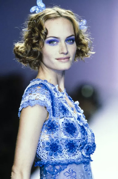 アナ スイの1997年春夏コレクションのランウェイに登場したアメリカ人モデルのアンバー・ヴァレッタ。(ニューヨーク、1996年9月)