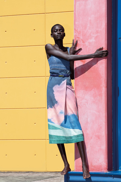スカートにもフランコ・フォンタナの作品がプリントされている。デニムのビュスチエ¥37,400、スカート¥99,000/ともにスポーツマックス(マックスマーラ ジャパン)
