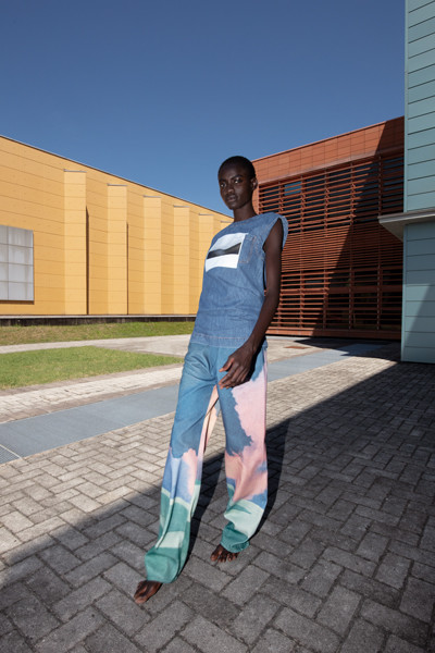 トップには、フレーム風の仕上げ処理で作品をあしらい、ゆったりとしたパンツにはフォンタナの写真が総模様プリントで表現されている。まさに着るアート作品。デニムトップ¥37,400、パンツ¥99,000/ともにスポーツマックス(マックスマーラ ジャパン)