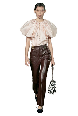 可憐なパフスリーブはちょっぴりケープ風。レザーパンツでミニマルに着こなして。