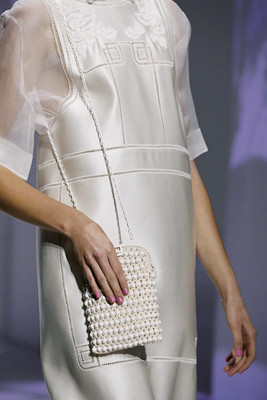 フェンディ家の思い出が着想源。 ビーズを編み込んだニットのがま口バッグに手を添えて、上品な佇まいに。