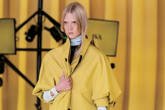 トレンチコートの襟を立て、前を手でつまむ。ミウッチャとラフによる新生プラダは、身を守るようなジェスチャーで定番アイテムをアップデートした。