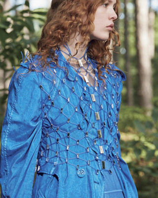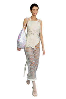 アクネ ストゥディオズのテーマは「光と自己解放、自己再生」。シルバーのメッシュドレスの上から、ラフなカットのエプロン風トップをレイヤード。