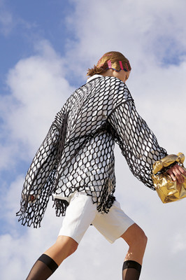 黒×白のコントラストでメッシュを強調。青空背景のビジュアルが爽快。©Viviane Sassen