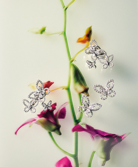 何世紀も前から蝶はさまざまなジュエリーにデザインされているけれど、ロンドンのジュエラー、グラフが生み出す新しいバタフライはとびきりエレガント。透ける繊細な羽のフォルムで、立体感や軽快感も演出している。