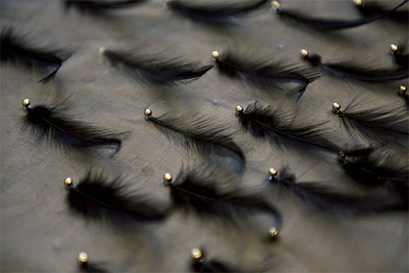 羽根細工もルマリエのシグネチャー。今季は、メタルスタッズで伝統的なサヴォワールフェールを新鮮に生まれ変わらせた。