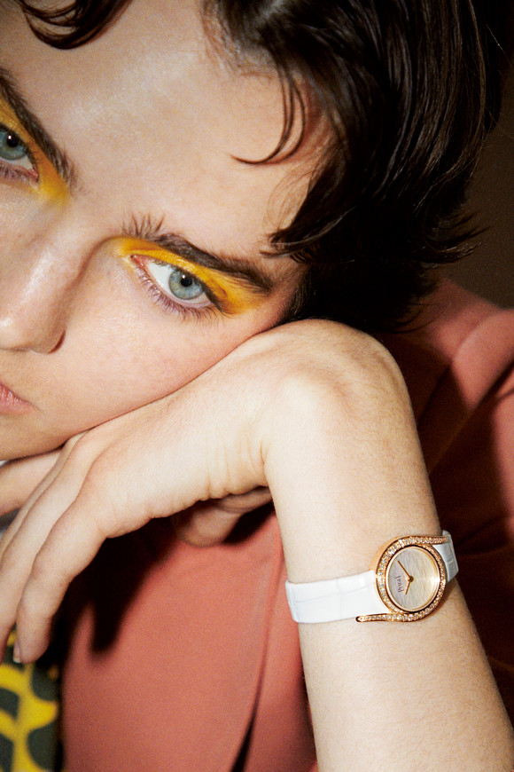 時計「ライムライト ガラ」(PG×ダイヤモンド× MOP、アリゲーターストラップ、φ26mm、クオーツ、300本限定)¥2,882,000/ピアジェ(ピアジェ コンタクトセンター) ジャケット¥315,700、T シャツ¥66,000/ともにクロエ(クロエ カスタマーリレーションズ)
