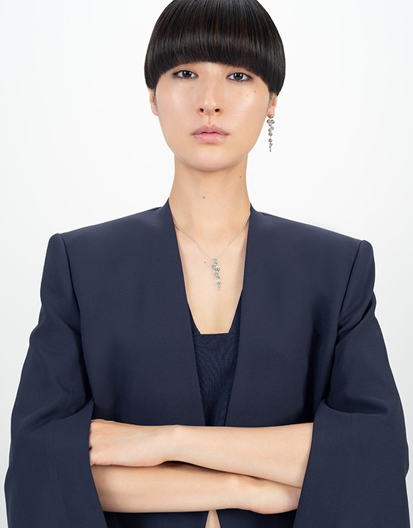 ブランドの代表的なアールヌーボーのスタイルが、モダンなジュエリーへと生まれ変わったコレクション「ムーンライト グレープ」。一日の始まりとなる朝、クリーンなホワイトの世界で朝露のように輝くダイヤモンドが印象的。幾何学的なジュエリーには、ストイックなコーディネートで