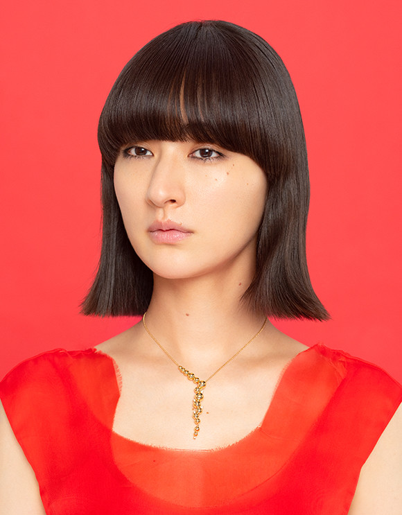 夏の夕焼けのような真っ赤な世界で存在感を増す、「ムーンライト グレープ」イエローゴールドのネックレス。繊細なチェーンはまるで蔦のように身体に沿い、輝き揺れるグレープのモチーフが洗練された首元を演出する。ジュエリーに合わせたコンテンポラリーなムードのファッションで、アートな気分を全身に纏う。