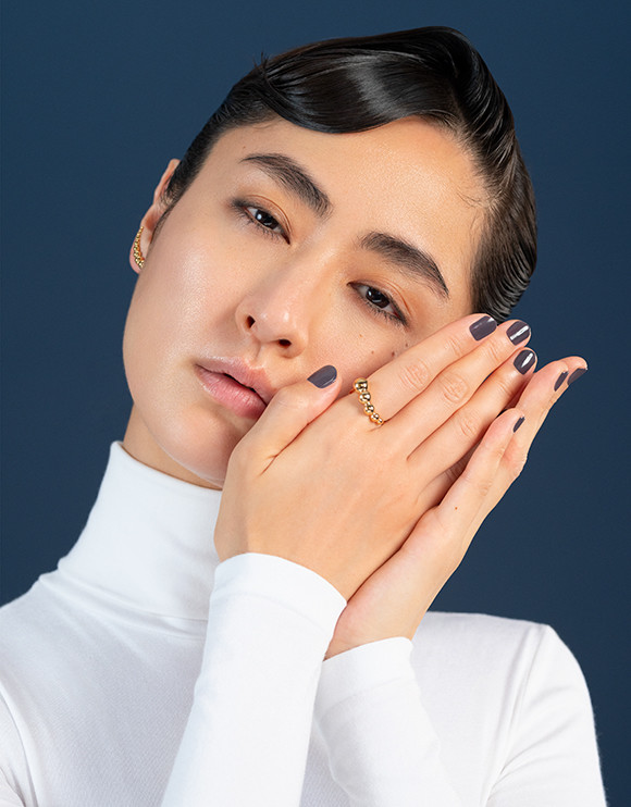 夜空のような濃紺の空間で光を放つのは、新たに加わったアシメトリーなデザイン。ピアスとしても身に着けられるイヤカフは天に向かって細く、リングは大小の粒が滑らかに弧を描く。さり気なくも凛とした存在感で、女性たちの日常に輝きを添える。
