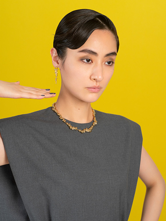 太陽のもと育った豊かな実のように、大小の丸いモチーフとダイヤモンドをランダムに描き出した有機的なジュエリーは、日の光を浴びながら、身体の動きに合わせて自由に揺れる。ピアスとネックレスをコーディネートすれば華やかなシーンに。どちらかひとつなら、シンプルなTシャツなどと合わせてカジュアルダウンも。