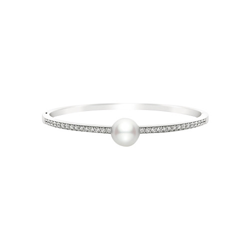 地金にダイヤモンドとブランドロゴをあしらい、光沢の美しい白蝶真珠をアクセントに。リュクスな素材をミニマル&モダンに表現した、気品漂う珠玉の逸品。ブレスレット(WG×白蝶真珠×ダイヤモンド)¥935,000/ミキモト(ミキモト カスタマーズ・サービスセンター)