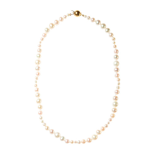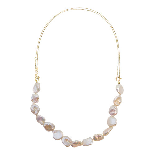 表情豊かな淡水パールの個性を生かしたエターナルなデザイン。さりげなく二重になったチェーンは伸ばせば一重でも使えるので、ロングネックレスとしても楽しめる。ネックレス「プリンセッサパールネックレス」(YG×淡水パール)¥71,500/ アリータ(パラグラフ)