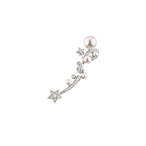 パールとダイヤモンドの星屑が流星のように煌めく。片耳だけでも存在感たっぷりのイヤカフは、ピアスとクリップオンの2カ所で留めるデザイン。イヤカフ「コメット コレクション」(WG×パール×ダイヤモンド)¥1,144,000/シャネル(シャネル カスタマーケア)