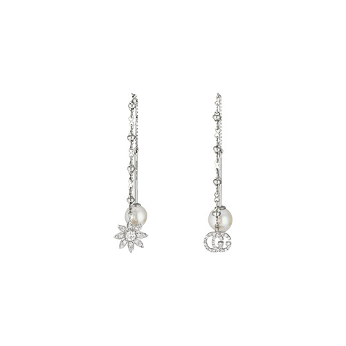 フラワー×ダブルG というブランドを象徴するモチーフをアシメトリックに配して。揺れるたびにパールが覗く可愛さ。カジュアルなデニムスタイルのアクセントにも。「グッチ フローラ イヤリング」(WG×パール×ダイヤモンド)¥440,000/グッチ(グッチ ジャパン)