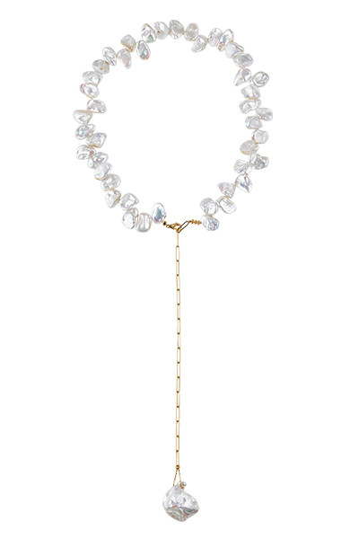 花びらのようなペタルパールが可憐な印象。チェーンを前に垂らせばラリエット風、後ろに回せばチョーカーに。スタイルによって異なる表情を楽しみたい。ネックレス「パールデュオ チェーン」(YG×淡水パール)¥132,000/ミラモア(ミラモア ファイン ジュエリー)