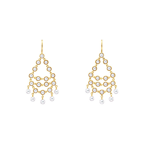 ミニパールをしずく状に配したハンギングピアス。シャラシャラと揺れ動くパールが、楽しくダンスしているよう。ドレッシーなスタイルはもちろん、Tシャツでもこれさえあればおしゃれにキマる。「ダンシングパール ピアス」(YG ×あこや真珠)¥605,000/TASAKI