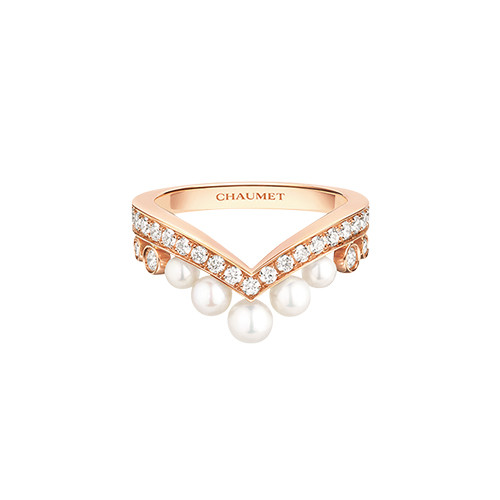 メゾンの歴史と所縁の深いナポレオンの妃、皇后ジョゼフィーヌにオマージュを捧げて。プリンセス気分が味わえるティアラのようなデザインは、パールで抜け感を。「ジョゼフィーヌ」コレクション エグレット リング(PG×あこや真珠×ダイヤモンド)¥567,600/ショーメ