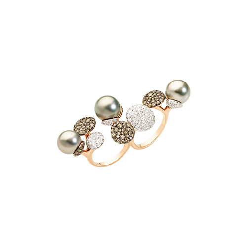 接置面にジョイントが隠されており、グレーのタヒチアンパールとダイヤのディスクがかすかに動くデザイン。遊び心あふれるダブルリング「サッビア」(RG×タヒチ産パール×ホワイトダイヤモンド×ブラウンダイヤモンド)¥2,442,000/ポメラート(ポメラートブティック 銀座店)