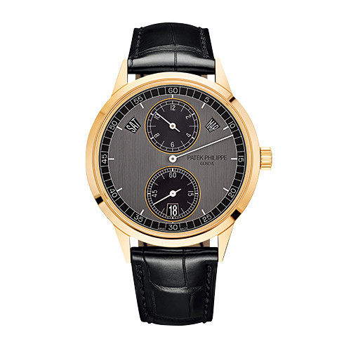 特許を取得した年次カレンダーにレギュレーター・タイプの時刻表示を備えた人気モデルのローズゴールド版。シックなツートーンの文字盤もポイント。