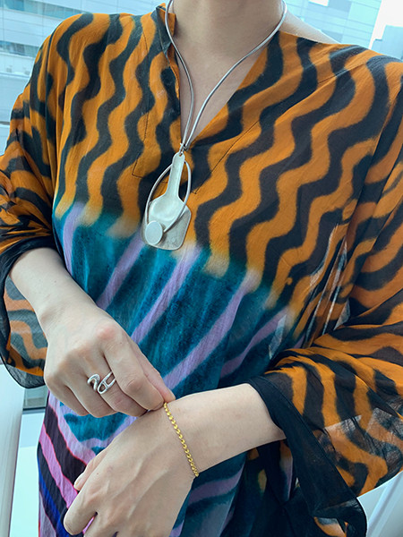右手の中指のシルバーのリングはエルメス。最近買い足したというゴールドのブレスレットは、マリー エレーヌドゥ タイヤック。リングとブレスレットはいつも同じものをつけているそう。