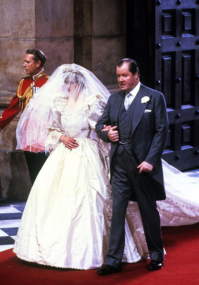 5. ウェストミンスター寺院でチャールズ皇太子と結婚式を挙げたダイアナ妃は、父にエスコートされて入場した。 (ロンドン、1981年7月29日)