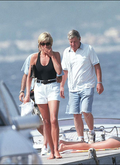 46. サントロペでパートナーのドディ・アルファイドと休暇を過ごすダイアナ妃(アルファイドはダイアナ妃の背後)。(フランス、1997年8月22日)