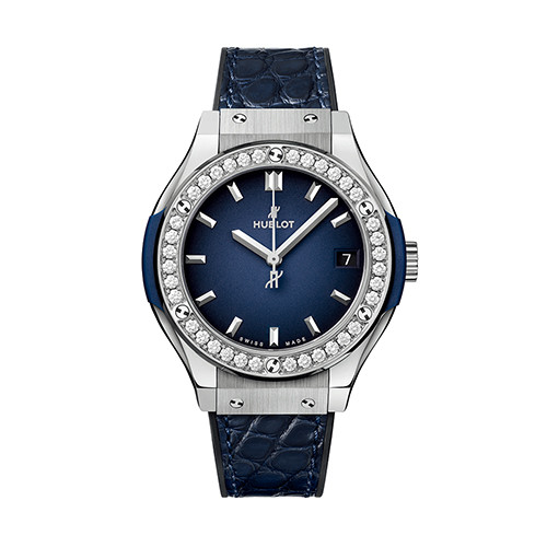 硬派な濃紺のウォッチに、ダイヤモンドが華やかさを添える。「クラシック・フュージョン チタニウム ディープブルーダイヤモンド」(φ33mm、アリゲーター×ラバーストラップ、日本限定)¥1,089,000/ウブロ(LVMHウォッチ・ジュエリー ジャパン ウブロ)