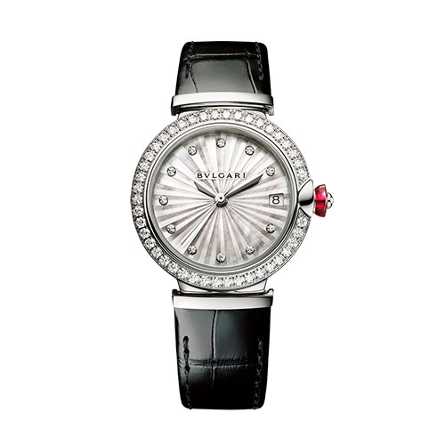 マザー・オブ・パールを、輝く太陽のごとく配して。寄せ木細工の前身であるインタルシオ(象嵌細工)に着想を得た贅沢な技巧。「ルチェア インタルシオ」(φ33mm、SS×ダイヤモンド×MOP、アリゲーターストラップ)¥1,111,000/ブルガリ(ブルガリ ジャパン)