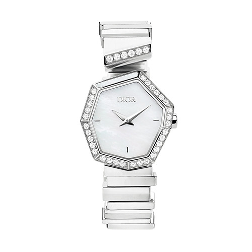 美しい天然石を彷彿させる有機的なシェイプ。鉱物を積み重ねたようなブレスレットにも注目。「ジェム ディオール」(27×25mm、SS×ダイヤモンド×MOP、ブラックレザーストラップ付き)¥1,210,000/ディオール タイムピーシズ(クリスチャン ディオール)