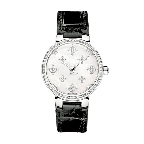 モノグラム・フラワーが白蝶貝の文字盤に咲いたフェミニンなウォッチ。「タンブールスリム モノグラム ディアモンダンテル」(φ28mm、SS×ダイヤモンド×MOP、アリゲーターストラップ)¥1,197,900/ルイ・ヴィトン(ルイ・ヴィトン クライアントサービス)