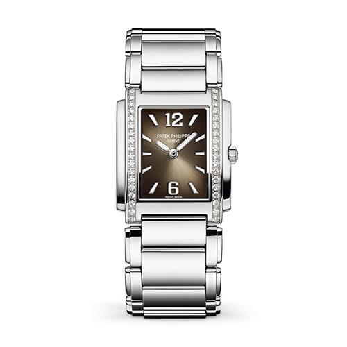 ブラックのグラデーションがクールな文字盤。サイドにさりげなく煌めくダイヤモンドがアクセントに。「トゥエンティ〜4」(30×25.1mm、SS×ダイヤモンド)¥1,694,000/パテック フィリップ(パテック フィリップ ジャパン・インフォメーションセンター)