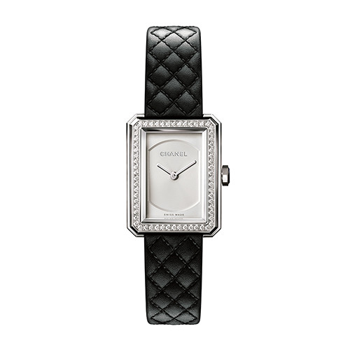 シャネルらしいキルティングパターンのレザーストラップに、気品漂うダイヤモンド。端正なウォッチが、恋人のように寄り添って。「ボーイフレンド」(27.9×21.5mm、SS×ダイヤモンド、カーフストラップ)¥880,000/シャネル(シャネル カスタマーケア)
