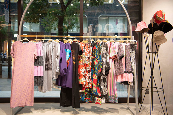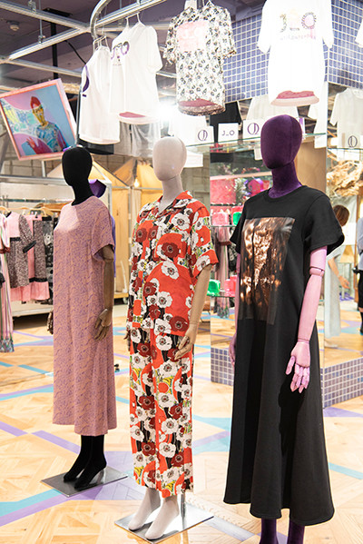 左から、フミエ・タナカとコラボしたワンピース¥57,200、アナ スイとコラボしたオープンカラーシャツ¥30,800、パンツ¥34,100、ヤンチェ_オンテンバールのオリジナルのリラクシングワンピース¥36,500