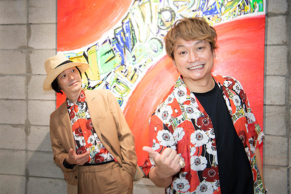 取材日に、偶然にも同じシャツをチョイスしたと話す香取&祐真。ともにアナ スイとコラボしたニューワールド柄のシャツを着て。