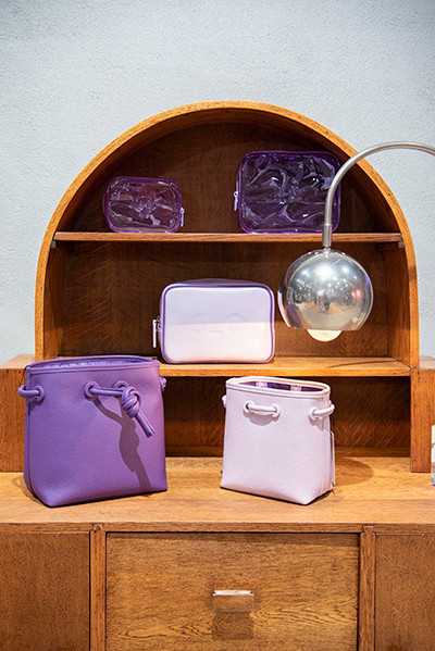 コラボレーション継続中のヴァジックのバッグも今回はブランドのキーカラー、濃淡のパープルで登場。左から、ライナーが「サクラ」柄のボンドミニ¥40,700、エニウェイ¥35,200、ライナーが「ニューワールド」のボンドミニミニ¥36,300。上の段は、オリジナルのポーチ。左から¥2,200、¥3,000