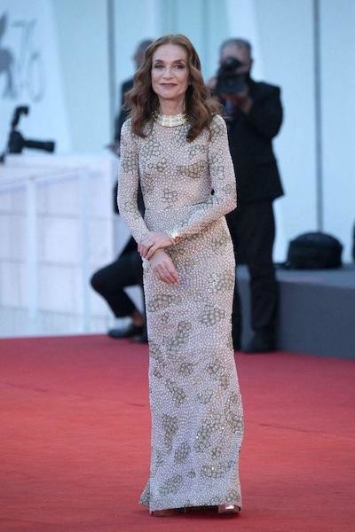 イザベル・ユペールのドレスは、ジョルジオ・アルマーニ・プリヴェのオートクチュール。体にぴったり沿うシルエット。(ヴェネツィア、9月1日)